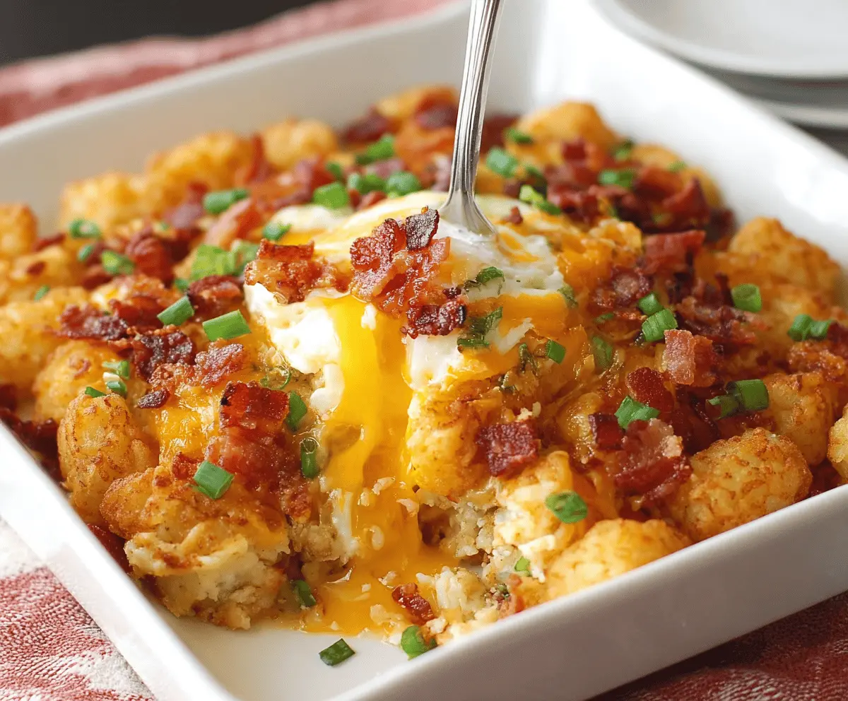 Enjoy this hearty and cheesy breakfast casserole that features crispy tater tots, savory bacon, melted cheddar, and fluffy baked eggs! It’s perfect for family brunch or special occasions!
