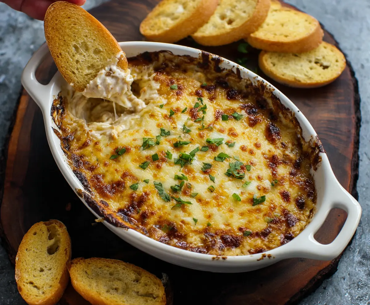 Once done, remove the dip from the oven and let it cool for a few minutes. Garnish with fresh chopped chives. Serve warm with sliced baguette or your favorite dipping items. Enjoy this crowd-pleaser at your next gathering!