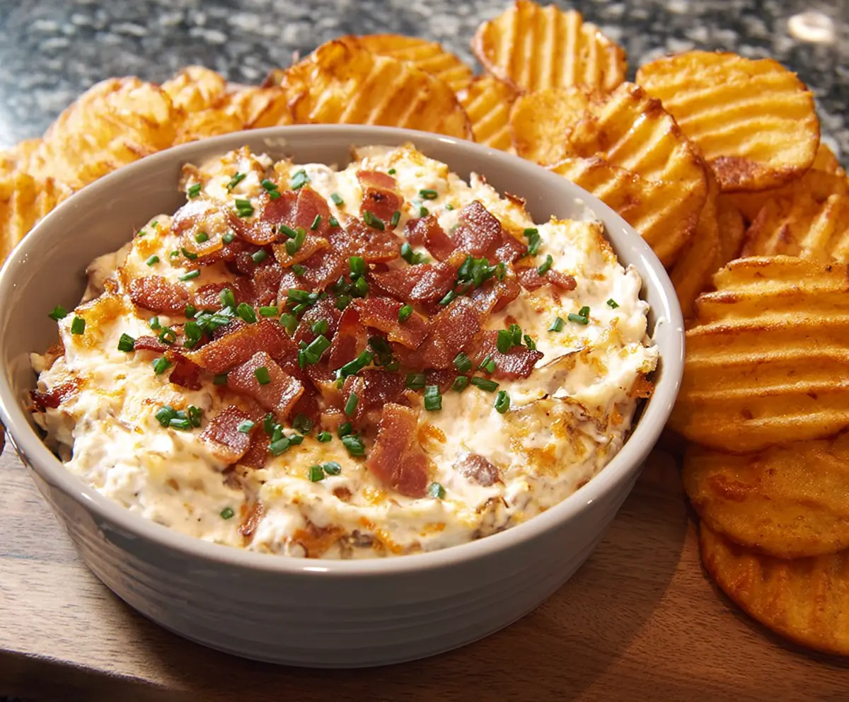 This baked potato dip is creamy and cheesy, just like your favorite loaded baked potato, but made for sharing! It’s packed with flavors like sour cream, cheese, and crispy bacon bits.