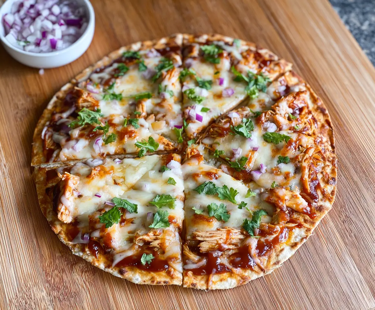 Enjoy your crispy, tangy BBQ Chicken Tortilla Pizza!