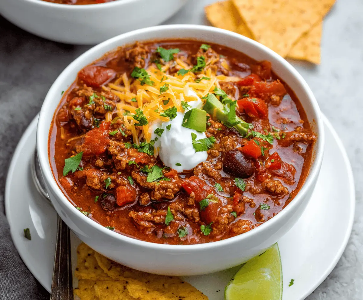 To serve, ladle the chili into bowls and top with shredded cheddar cheese, a dollop of sour cream, chopped cilantro, and sliced green onions. Don’t forget the lime wedges and optional tortilla chips for a crunchy side!