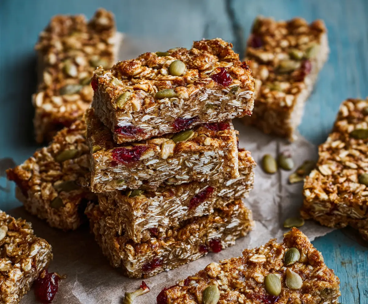 Healthy homemade breakfast bars with oats, nuts, and dried fruits on a rustic wooden table.