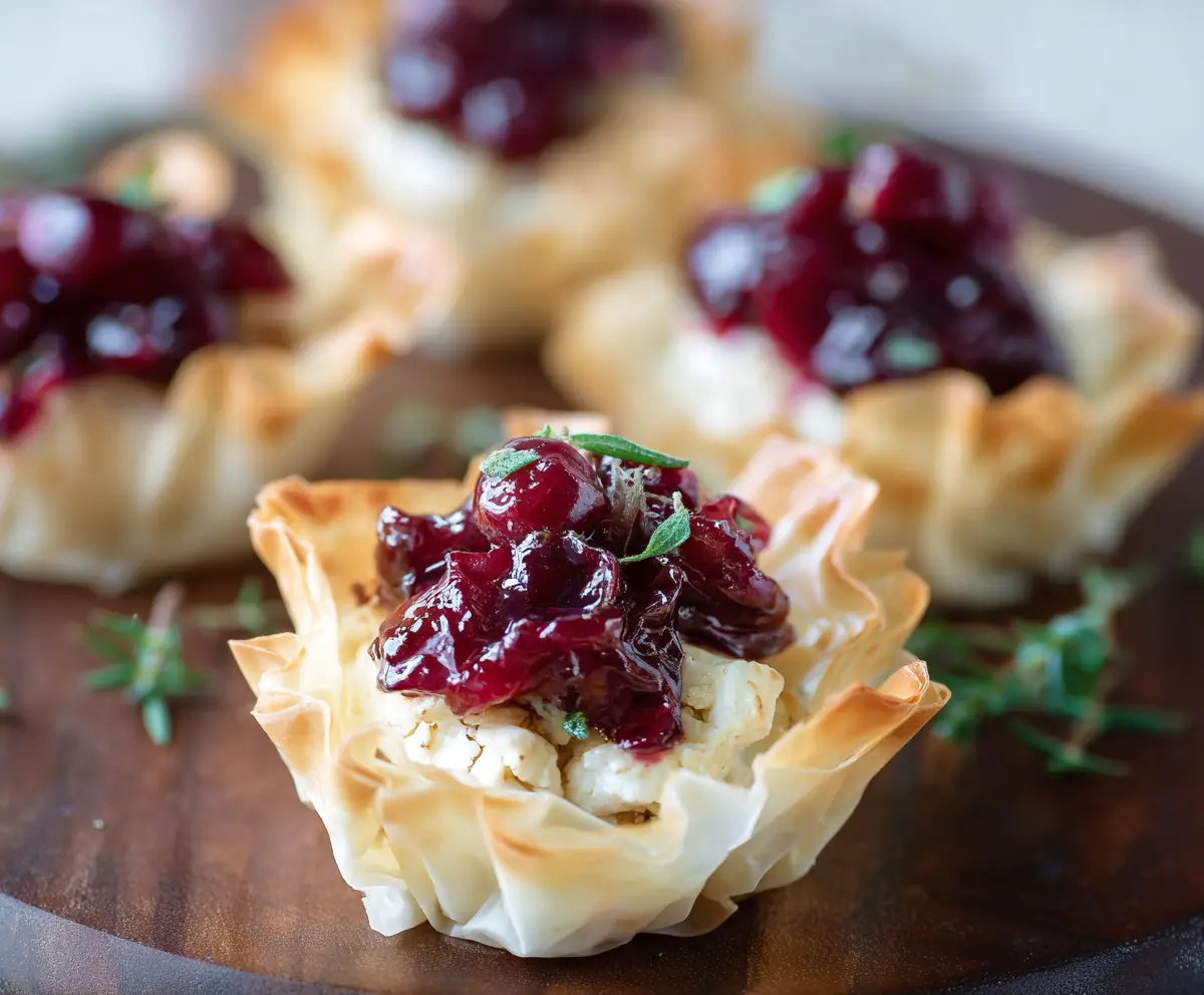These Brie Cranberry Phyllo Cups are a tasty treat! They have a crispy exterior with smooth cheese and tangy cranberry filling that makes every bite a delight.