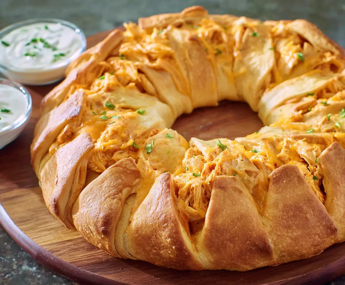 Delicious Buffalo Chicken Crescent Ring served hot with creamy dipping sauce