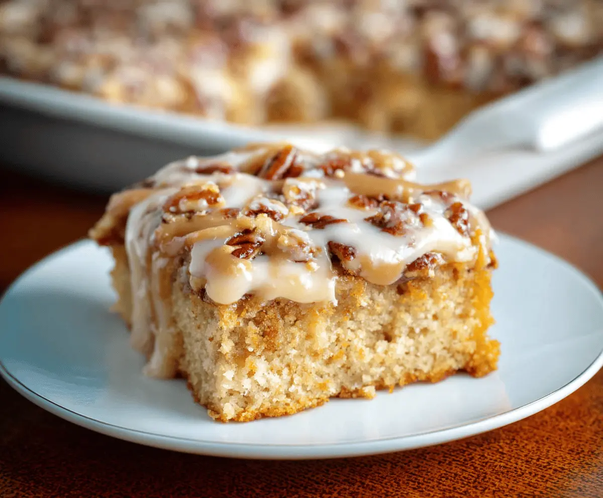 Once the cake is set and cooled, drizzle the frosting over the top. Cut into squares and serve! Enjoy the rich buttery flavors with the crunchy pecans and that luscious praline sauce soaking into each delightful bite!