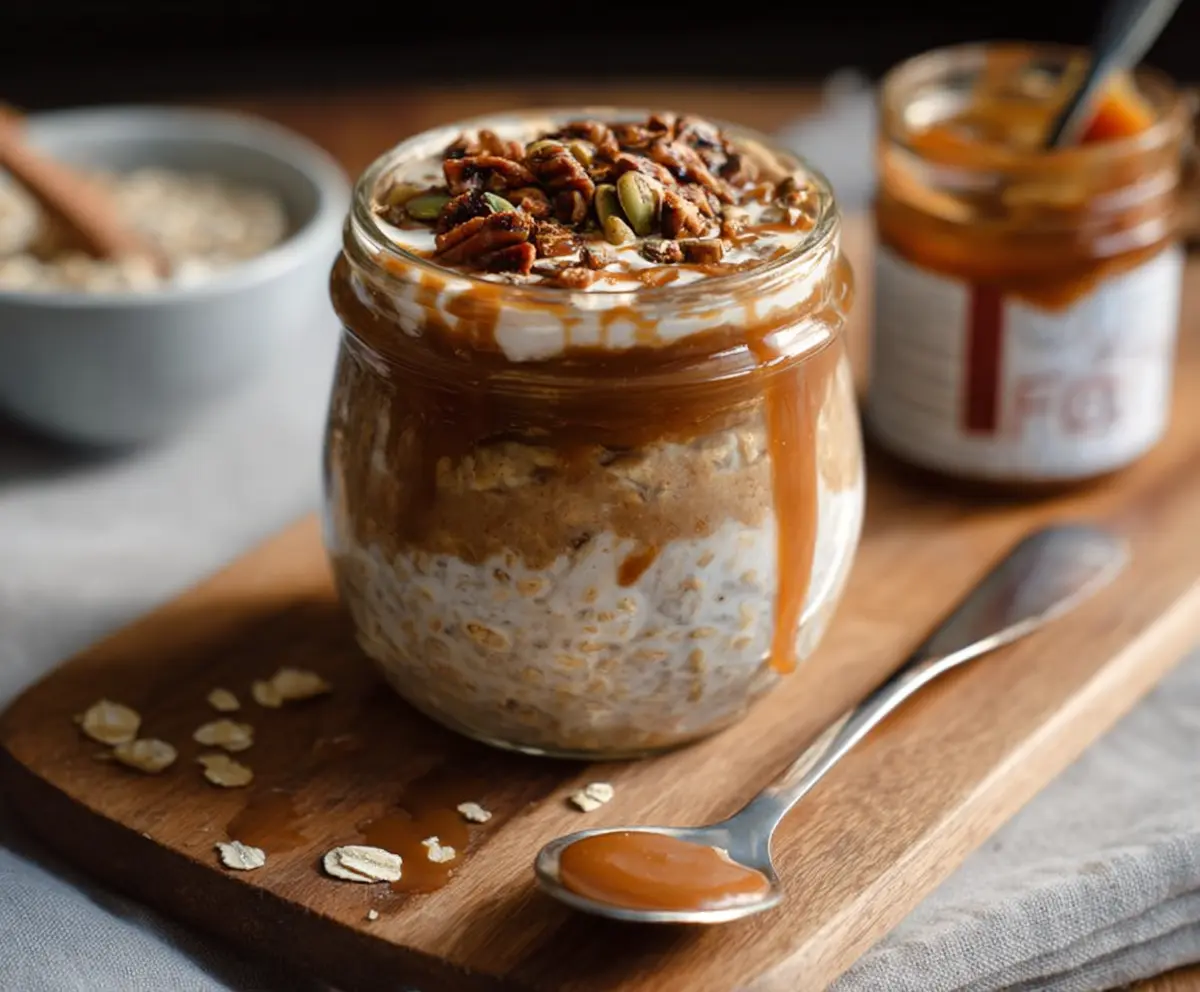Now comes the fun part! For that extra delightful flavor, add a layer of caramel sauce at the bottom of your serving jar or bowl. Spoon your prepared overnight oats on top of that. Then, you can get creative and add toppings like whipped cream or more yogurt, a drizzle of caramel sauce, and a sprinkle of granola or crushed nuts. Feel free to toss in some chocolate chips or cacao nibs for a little extra sweetness!
