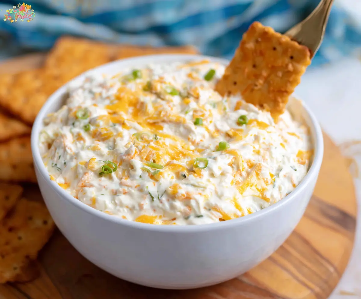 You can serve the dip immediately with crackers, chips, and fresh veggie sticks. If you prefer, you can also refrigerate it for about 30 minutes to let the flavors meld together further before serving. Enjoy this creamy, tangy, cheesy dip perfect for parties or snacks!