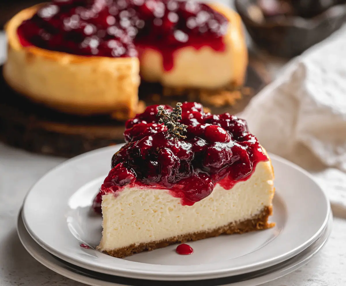 Enjoy this luscious cheesecake crowned with vibrant cranberry topping!