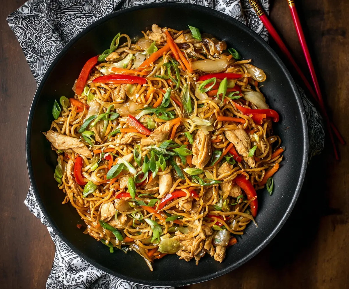 Delicious Chicken Yakisoba Noodles plated with vibrant vegetables and savory sauce.