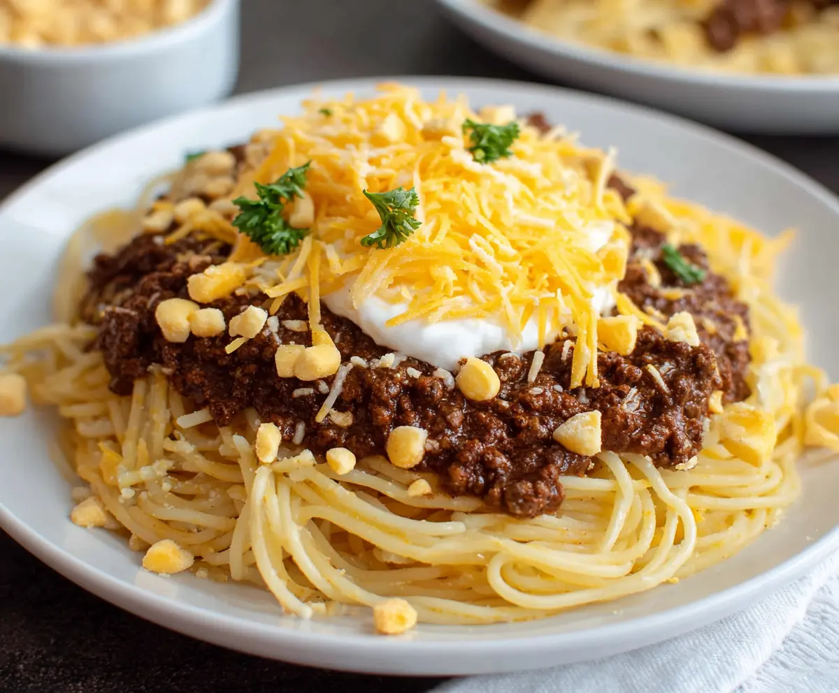 Cincinnati Chili Spaghetti is a fun and tasty dish that mixes spaghetti with a rich, spicy chili. It’s topped with shredded cheese, onions, and a sprinkle of sour cream for a delightful twist!