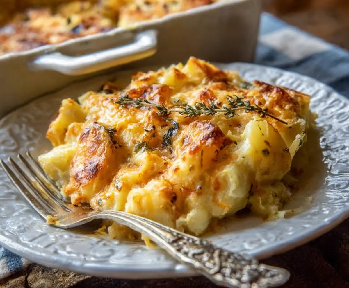 Delicious creamy cheddar potato bake with melted cheese and golden crust, perfect for comfort food lovers.