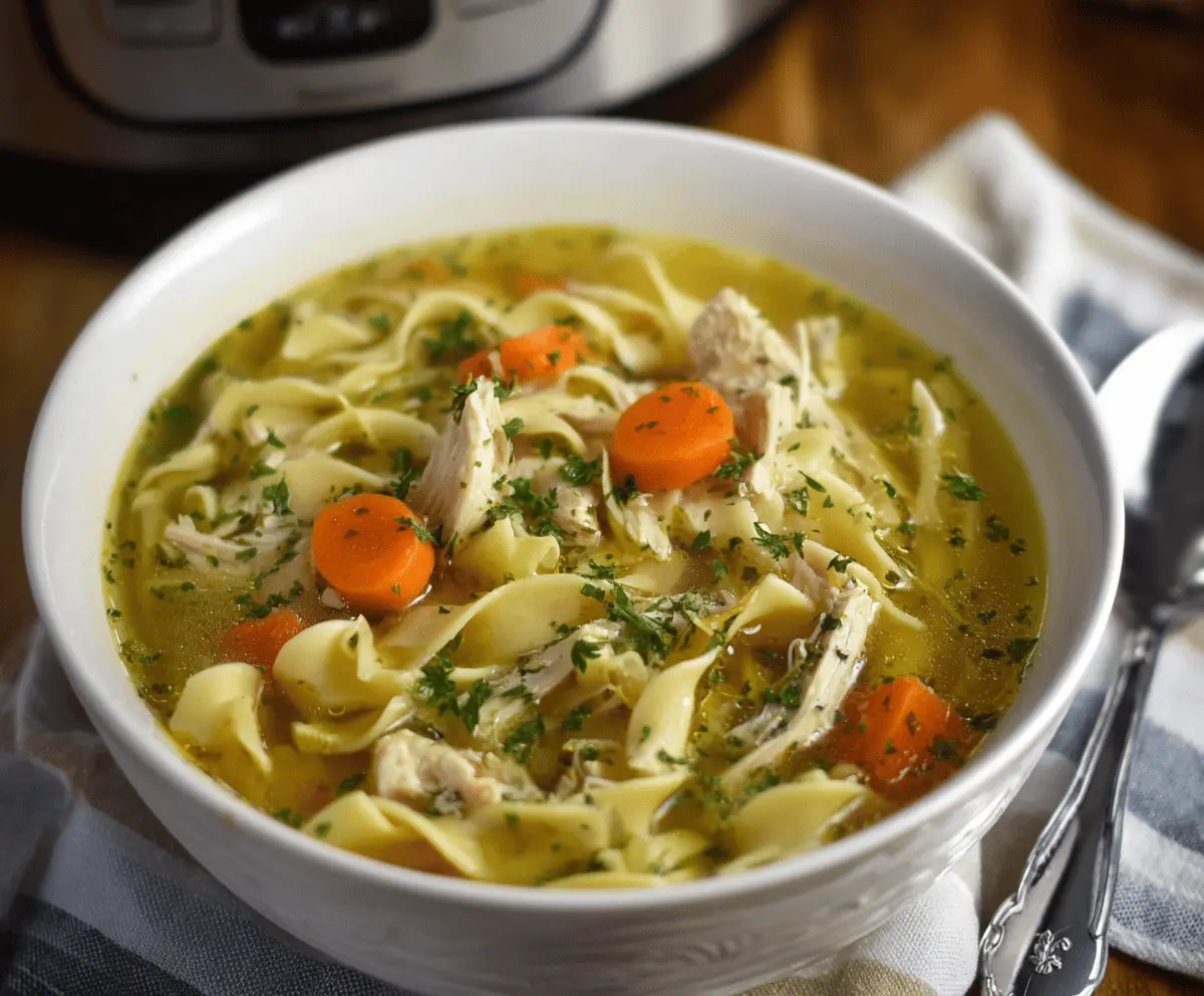 Creamy and hearty crockpot chicken noodle soup with tender chicken, vegetables, and noodles in a flavorful broth