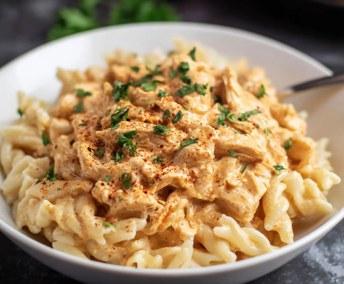Delicious Crockpot Chicken Pasta served in a bowl with garnished herbs.