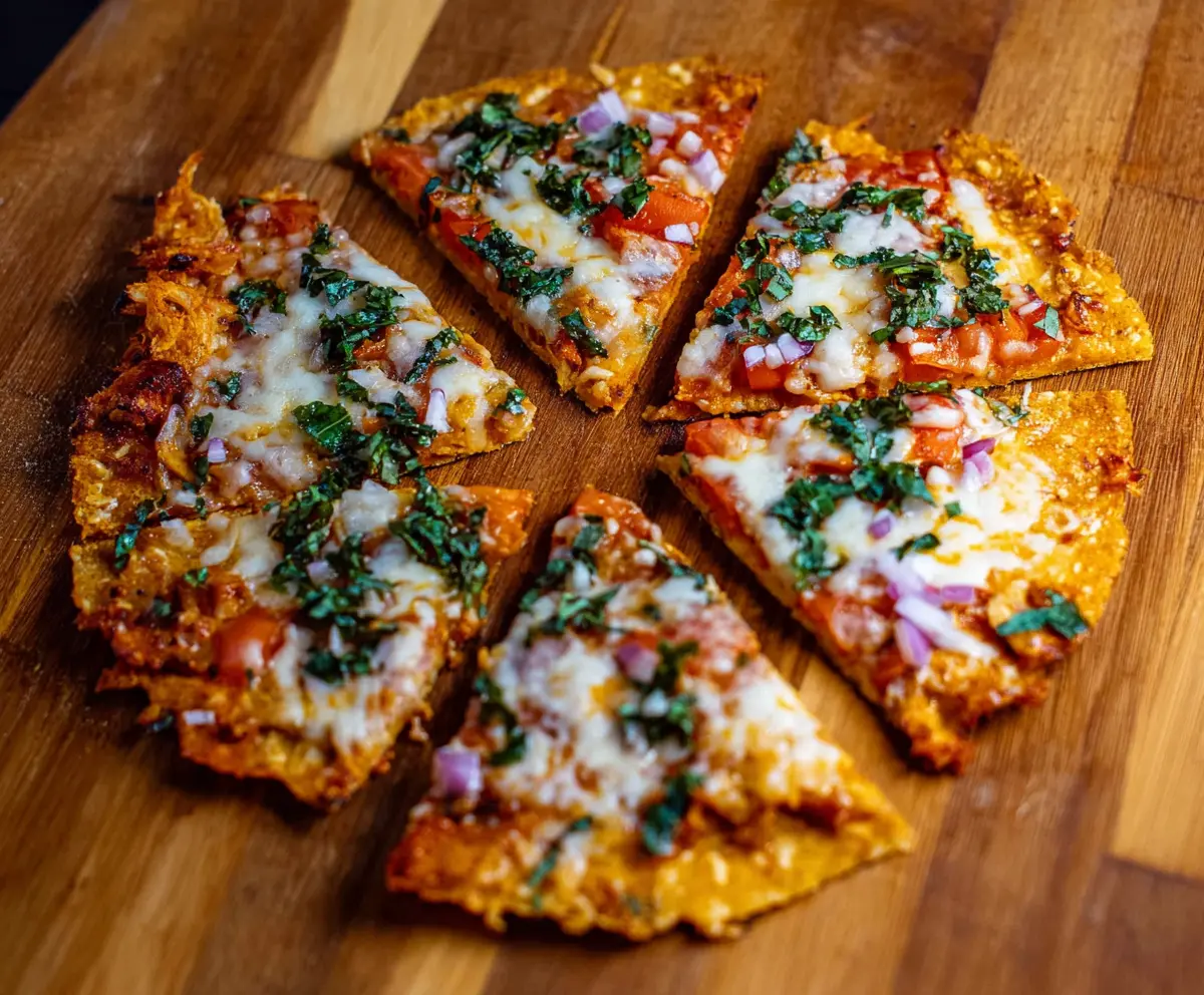 Once baked, take it out of the oven and let it cool for a minute. Garnish your pizza with fresh cilantro leaves for a pop of flavor. Now, slice it into wedges and serve immediately for a crunchy, cheesy treat!