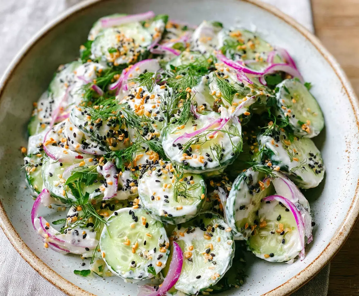 This refreshing cucumber everything bagel salad is a fun twist on a classic! Crisp cucumbers, creamy dressing, and the magical flavor of everything bagel seasoning come together beautifully.