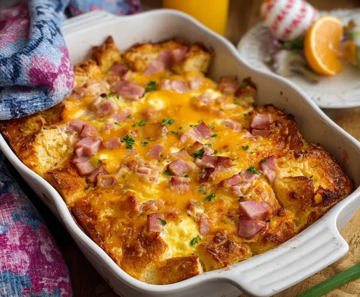 This Easter Cheesy Ham and Egg Casserole is a tasty way to celebrate! It features fluffy eggs, savory ham, and lots of gooey cheese, baked together for the perfect morning dish.