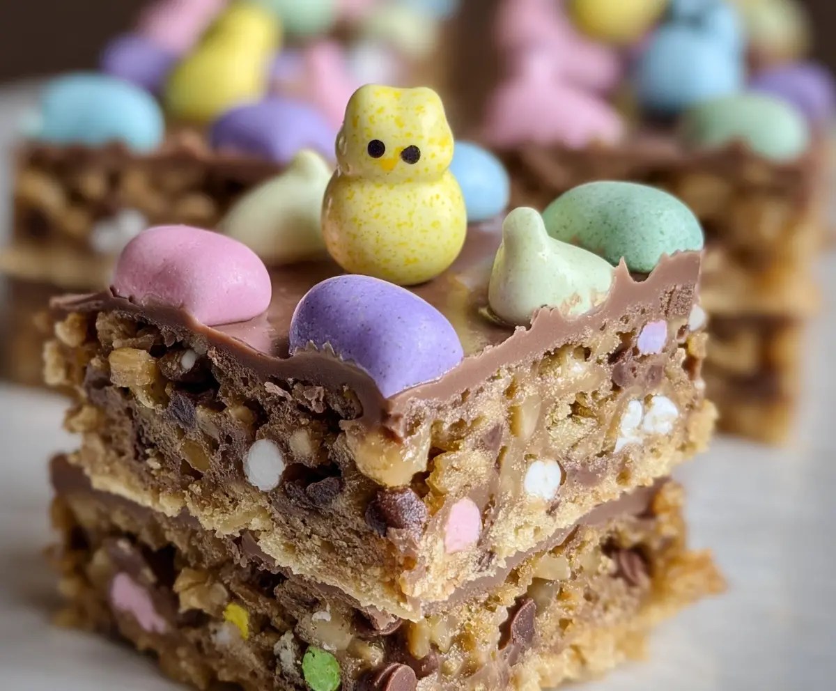 Enjoy your delightful Easter Goody Bars, combining crunchy cereal, creamy layers, and colorful decorations—perfect for celebrating the season!