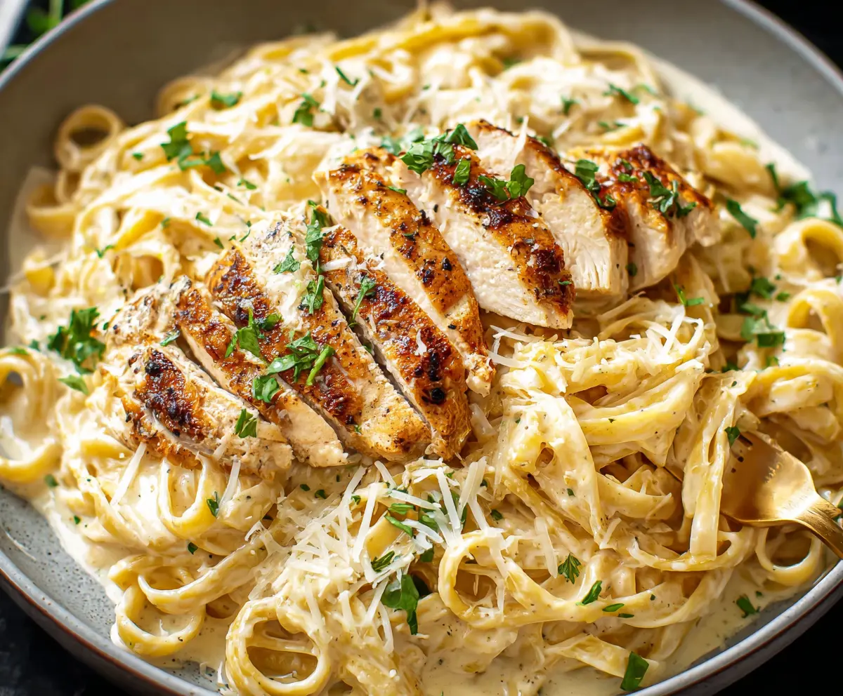 Season the sauce with salt and pepper to taste. Add the cooked fettuccine to the skillet and toss well to coat the pasta evenly in the creamy sauce. Finally, plate the fettuccine, top it with the sliced chicken, and garnish with fresh chopped parsley and more Parmesan cheese if you like.