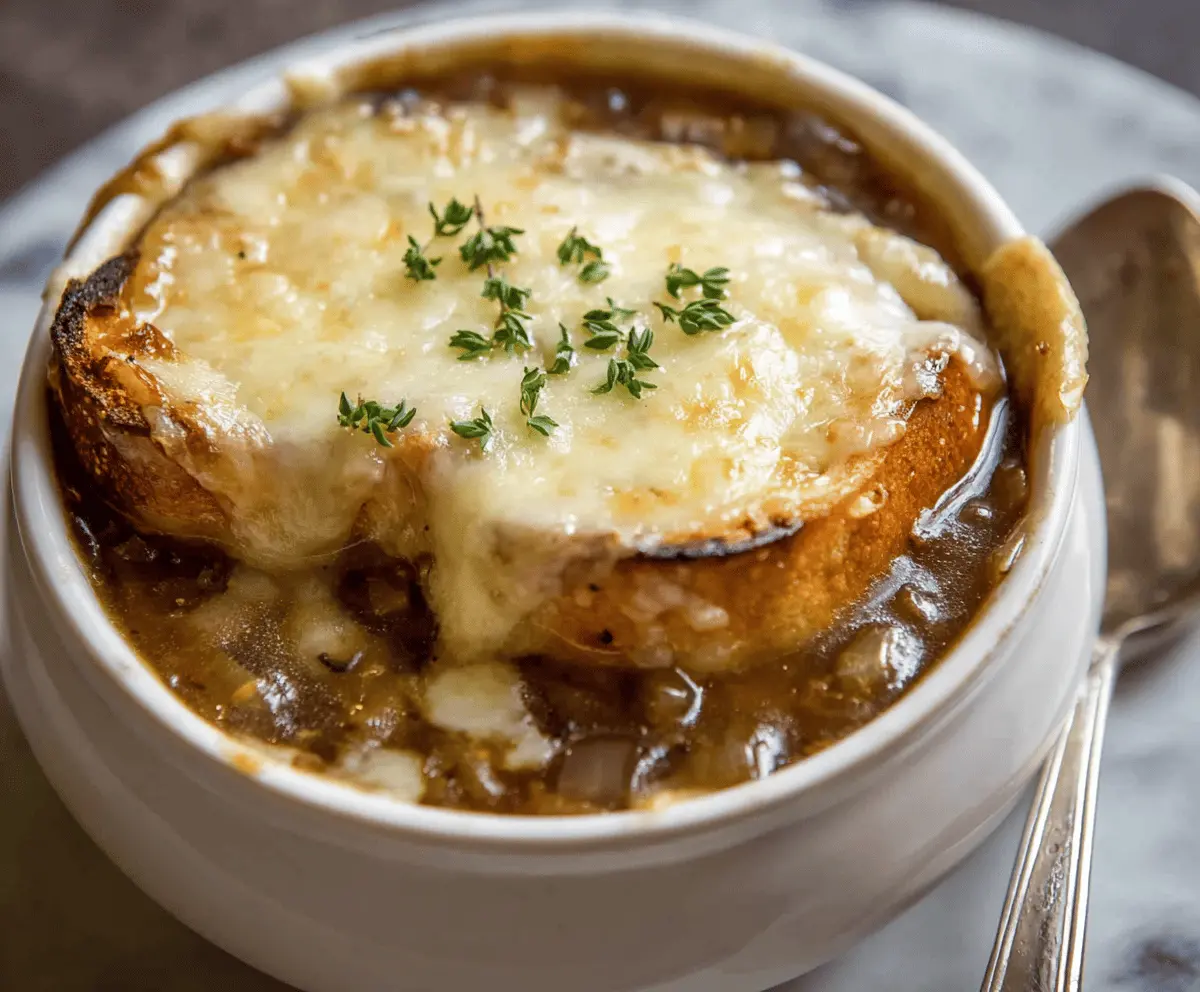 A steaming bowl of classic French Onion Soup topped with melted cheese and toasted baguette slices, garnished with fresh herbs.