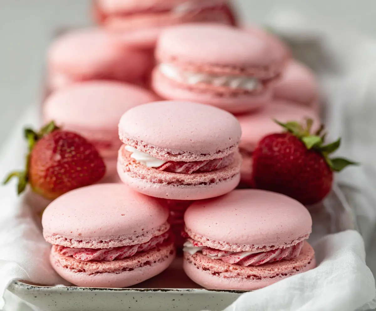 These French strawberry macarons are sweet little sandwich cookies with a yummy strawberry filling. Their crispy outside and soft inside make them so special!