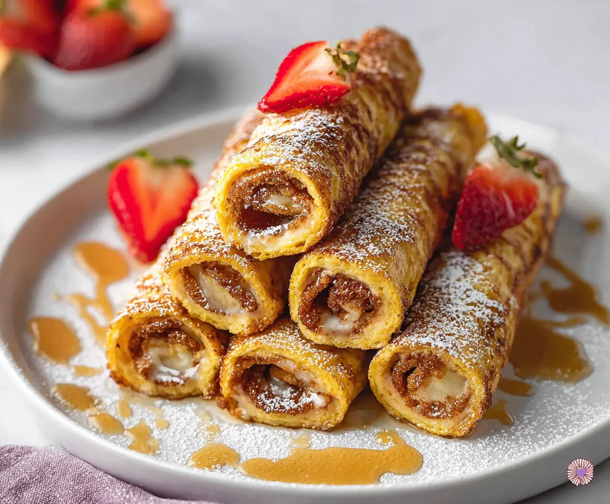 Once cooked, remove the roll-ups from the skillet and place them on a serving plate. Dust with powdered sugar and drizzle with maple syrup for sweetness. If you like, add some fresh strawberries on top for a lovely, fruity finish. Now they’re ready to enjoy—warm and delicious!