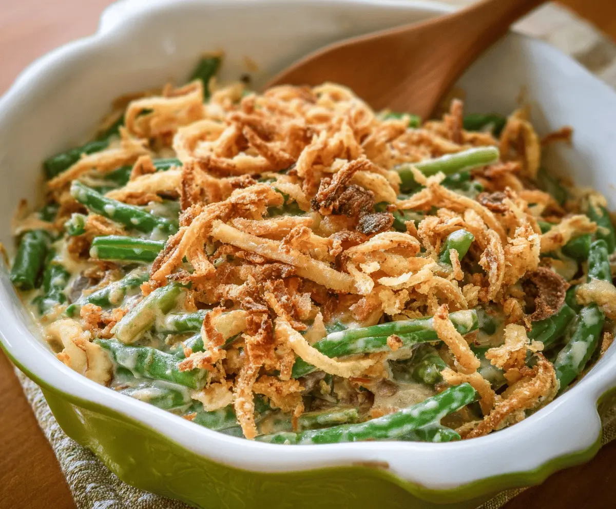 Delicious homemade green bean casserole topped with crispy fried onions, served in a baking dish for a classic holiday side dish.