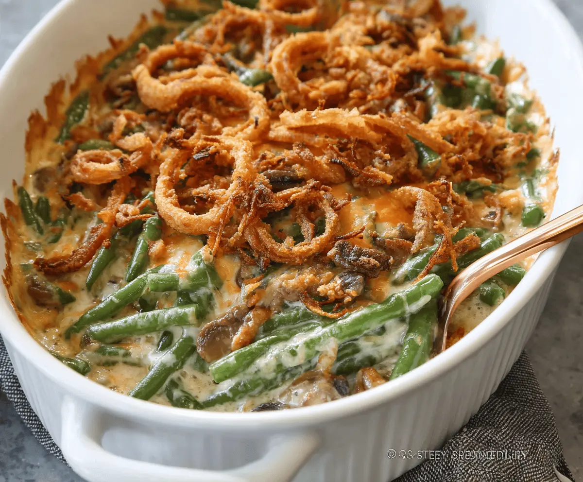 This green bean casserole is a cozy dish made with crunchy green beans and a creamy sauce, topped with crispy fried onions. It’s a classic favorite that brings warmth to any meal!