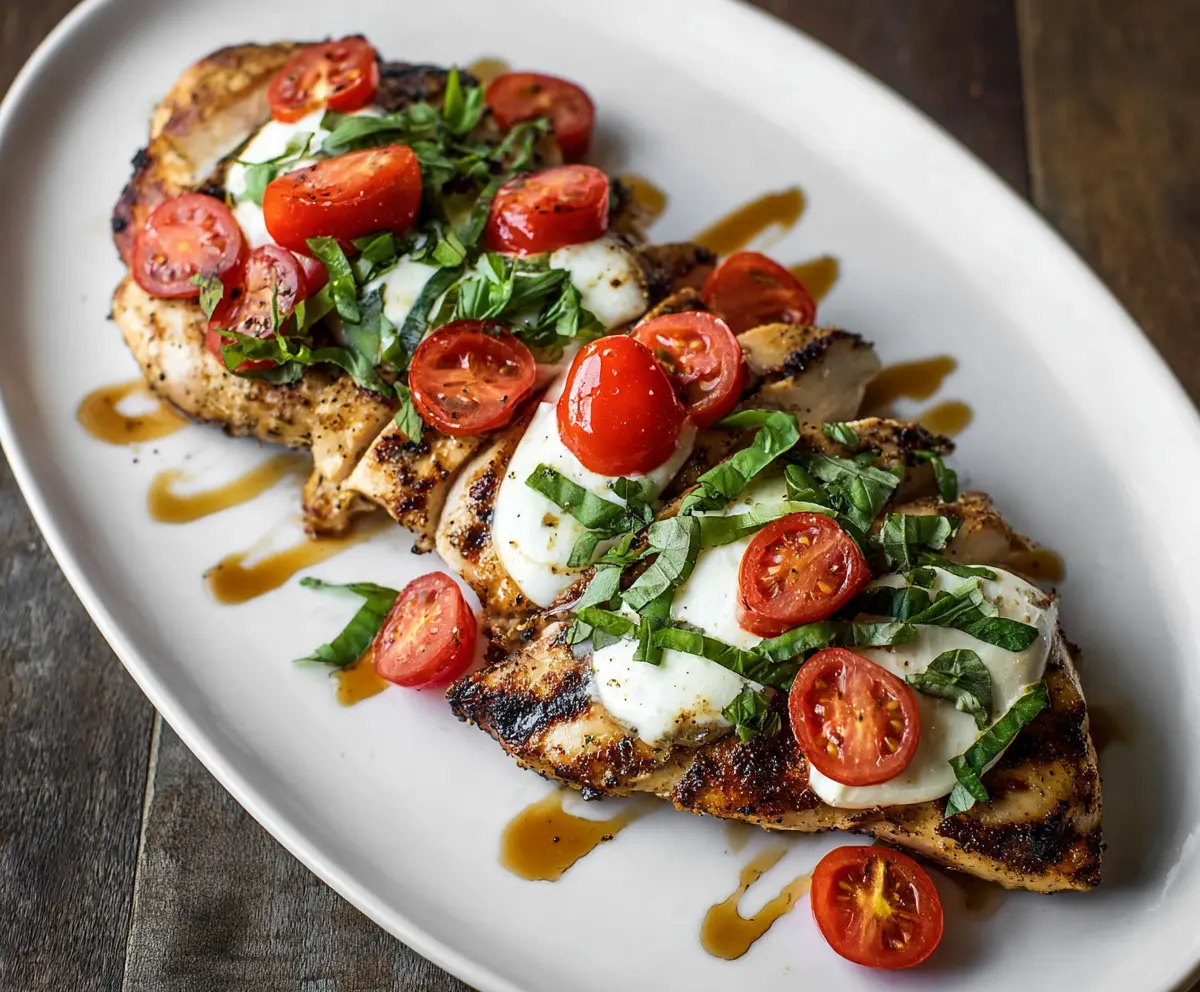 Delicious Grilled Chicken Caprese with fresh tomatoes, mozzarella, and basil on a platter.