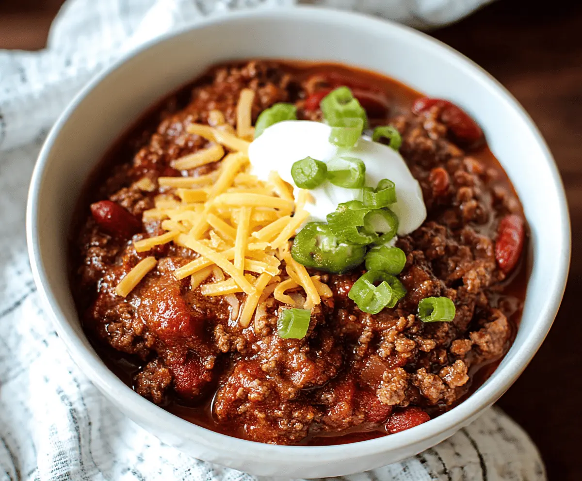 Dish out the chili hot into bowls, and don’t forget to add your favorite toppings like shredded cheddar cheese, a dollop of sour cream, and some chopped green onions for freshness. Enjoy your comforting bowl of ground beef chili!