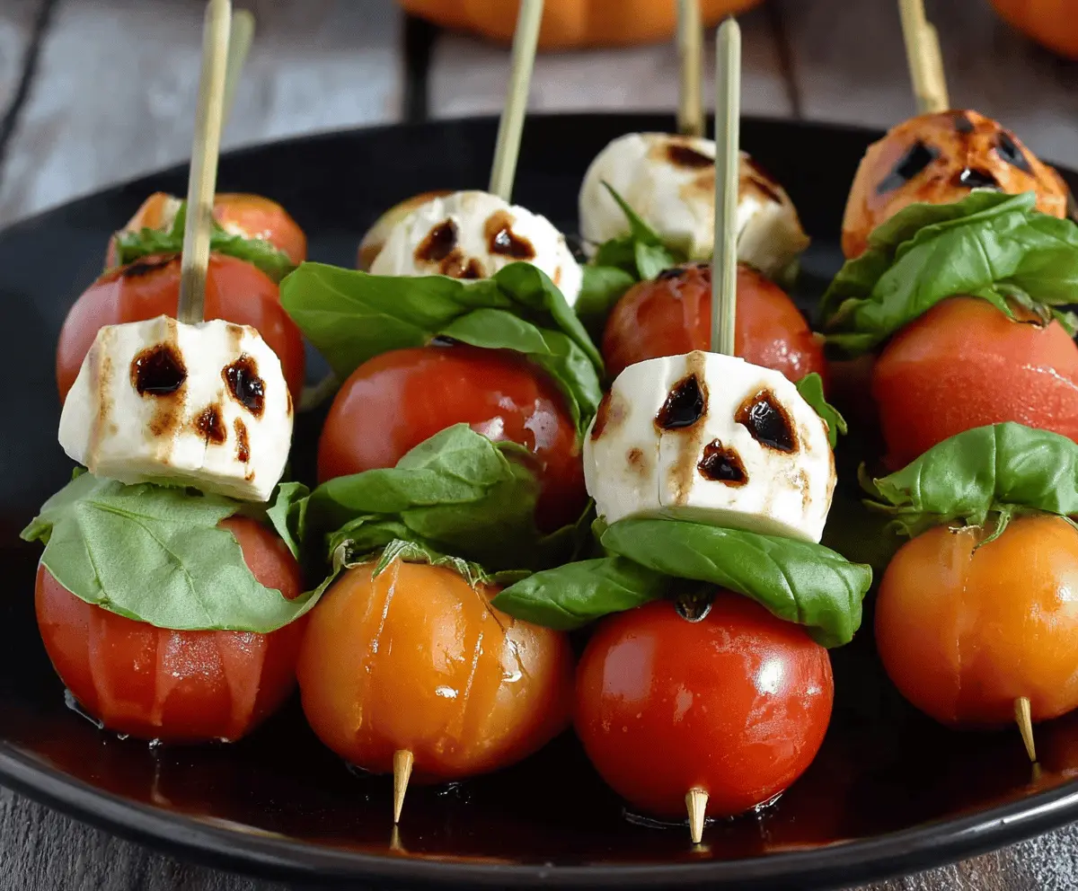 These Halloween Caprese Skewers are a fun twist on the classic appetizer! With fresh mozzarella, juicy cherry tomatoes, and basil, they look creepy yet delicious.