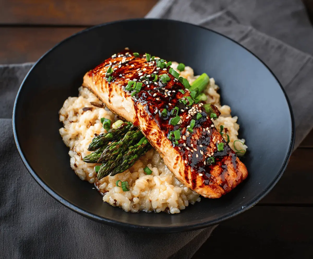 Dig in and relish this unique blend of flavors and textures in your comforting Japanese-style risotto topped with luscious seared salmon. Enjoy every bite!