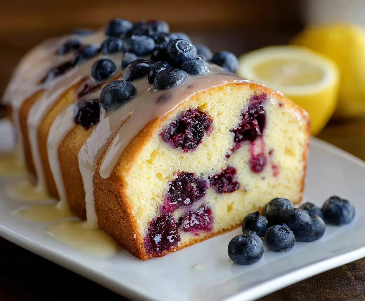 Slice the cake and serve it up! Enjoy the delightful mix of lemon and blueberries in this moist and flavorful pound cake. It’s perfect for a treat anytime!