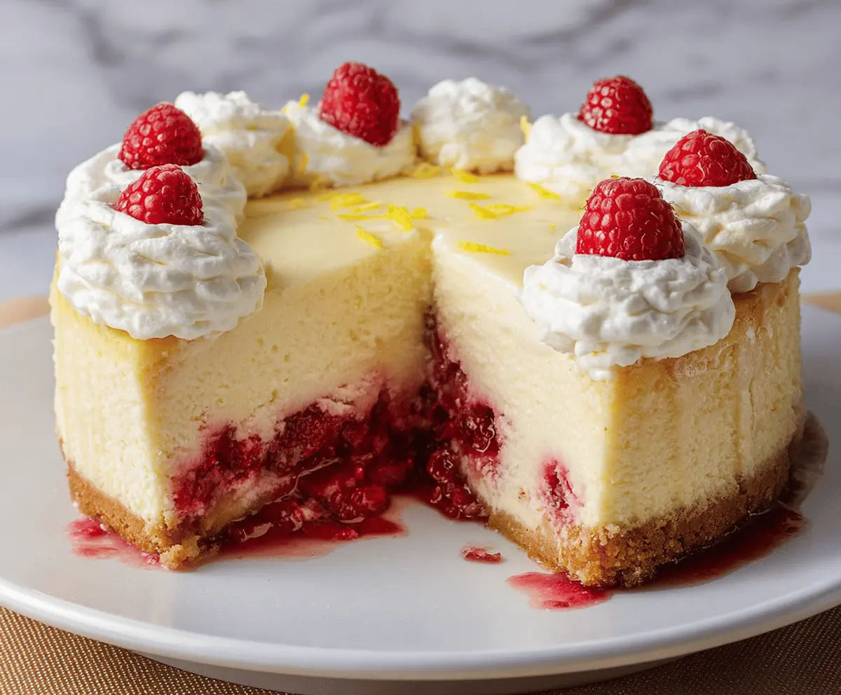 Delicious Lemon Raspberry Cream Cheesecake with fresh fruit and creamy filling