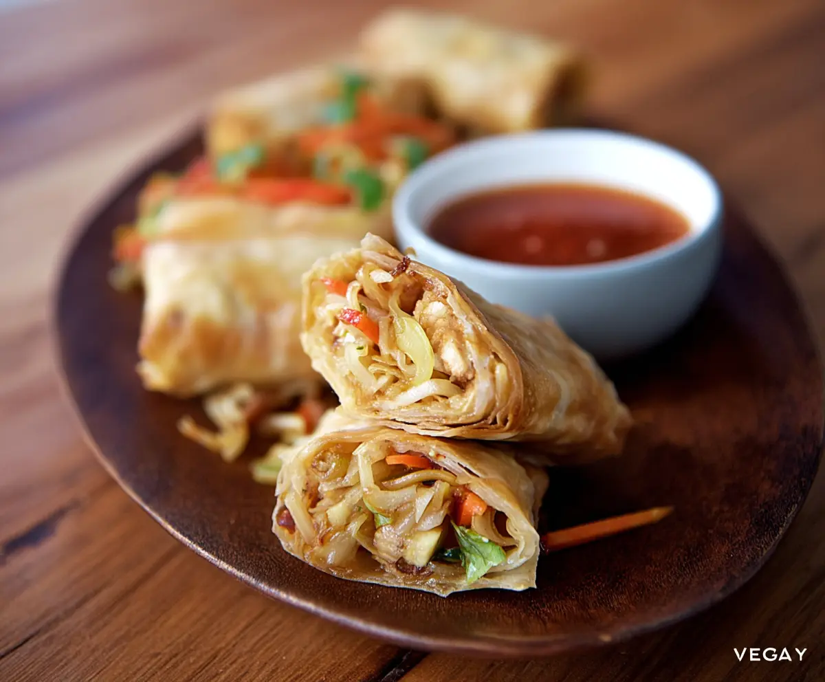 Your delicious Lo Mein Spring Rolls are ready! Serve them hot with the dipping sauce on the side. Enjoy your crispy and flavorful creation!