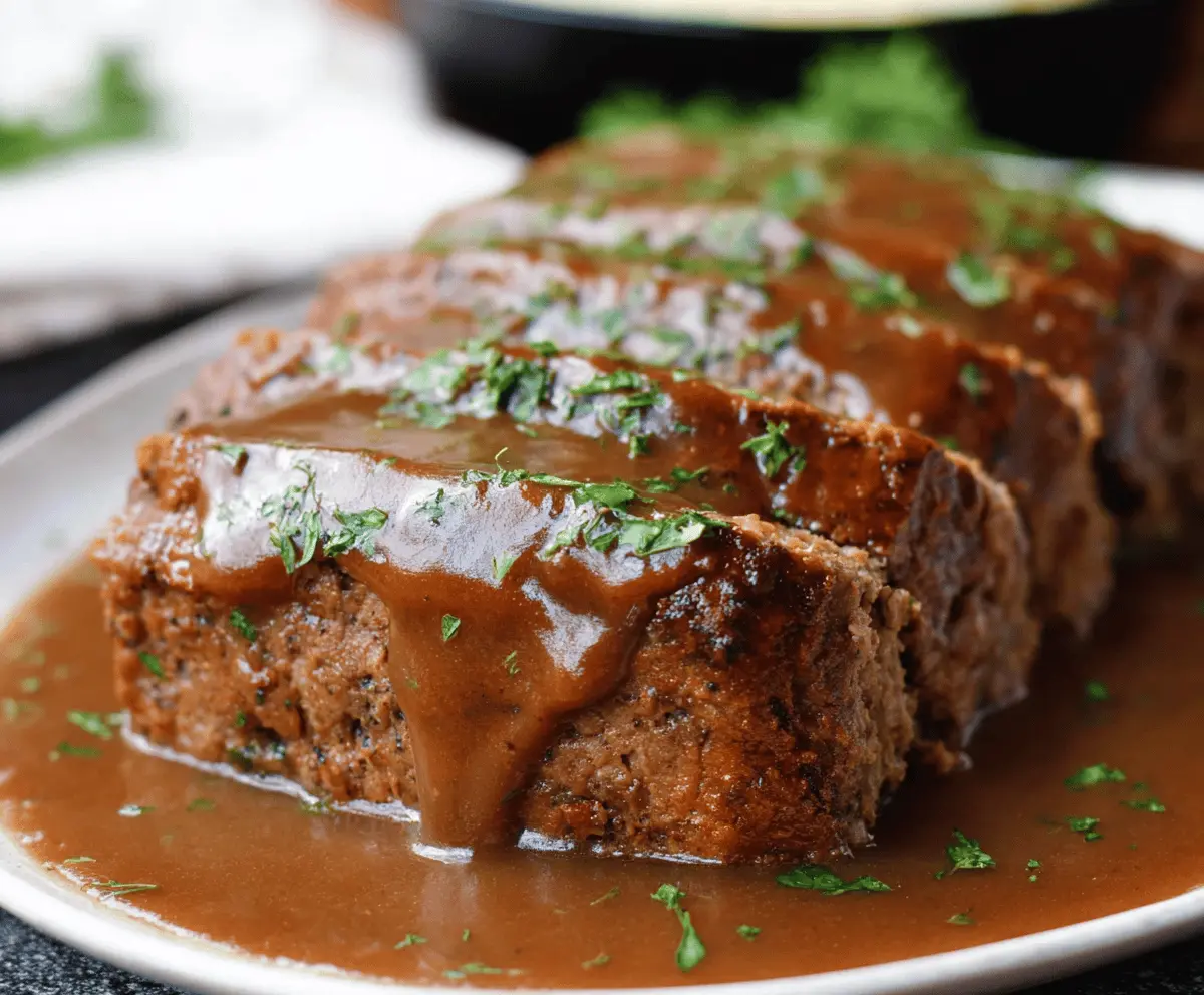 This meatloaf is a classic dish that combines ground meat with tasty seasonings, all topped with rich brown gravy. It’s warm, hearty, and perfect for family dinners!