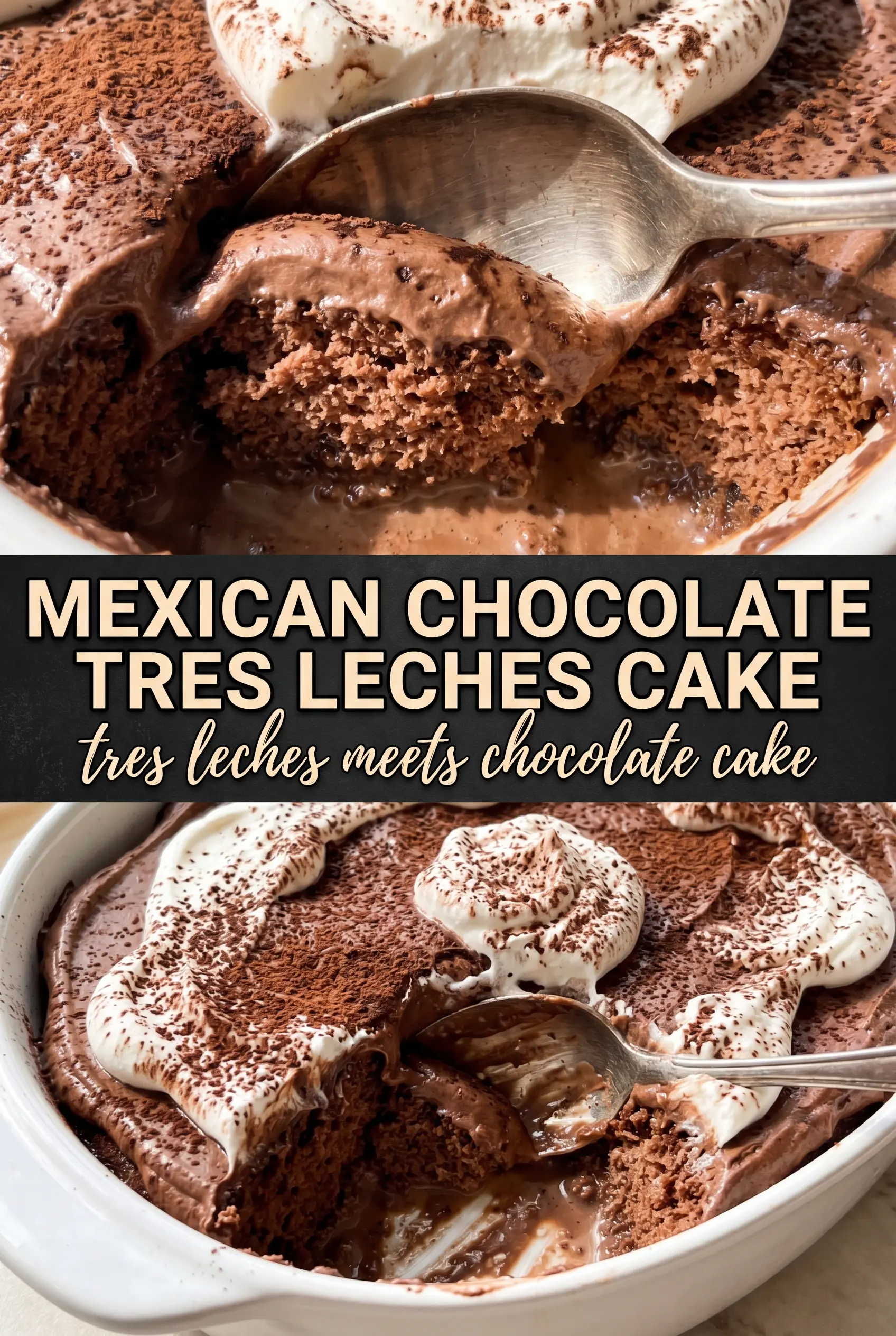 Mexican chocolate tres leches cake with rich cocoa layers soaked in a sweet milk mixture, then topped with whipped cream and cinnamon. Baked in a 9x13 pan and finished chilled so every slice stays tender and creamy.
