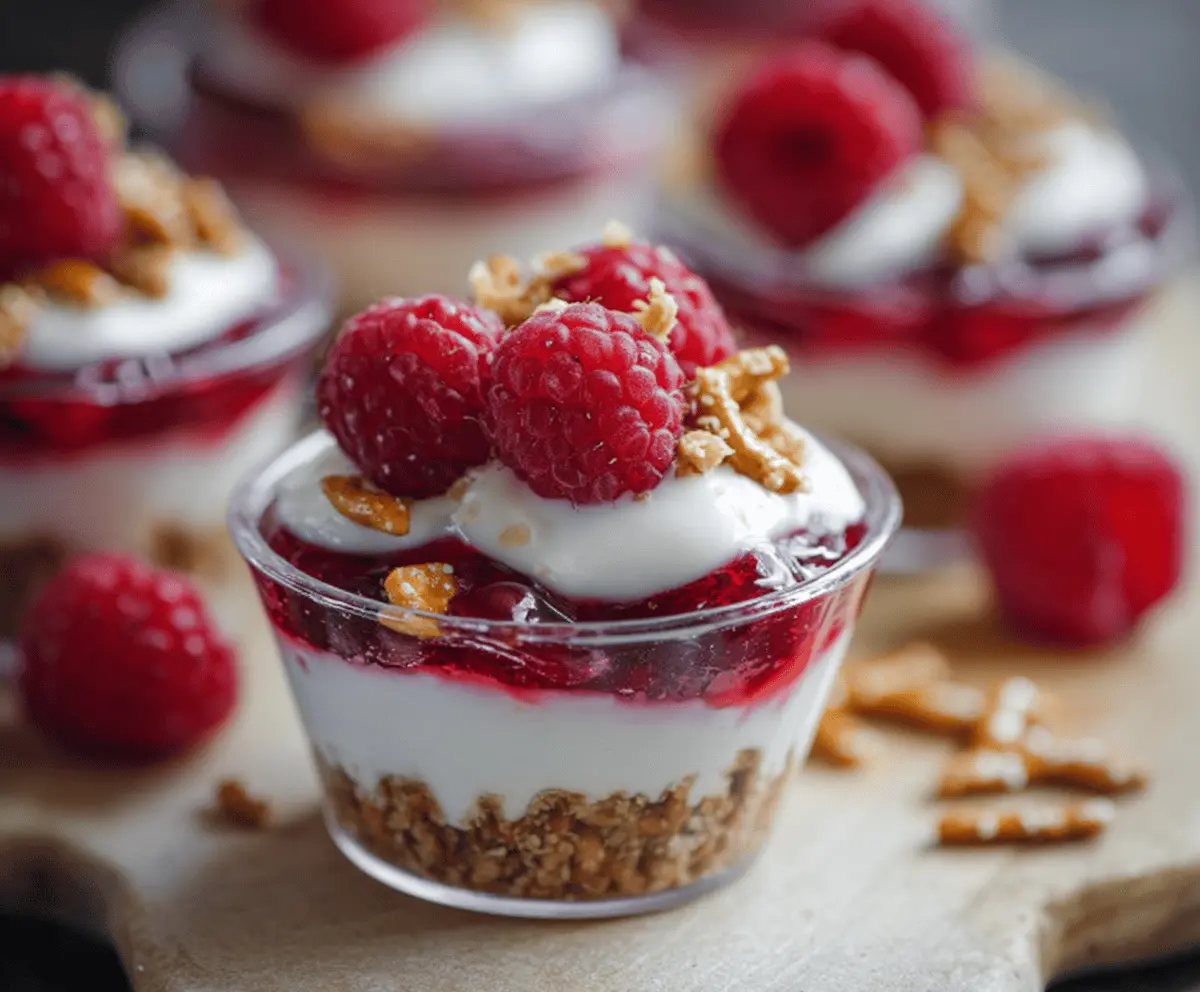 Top each cup with a dollop of whipped cream, a sprinkle of crushed pretzels for an extra crunch, and fresh raspberries for a beautiful finish. Looks so pretty, doesn’t it?