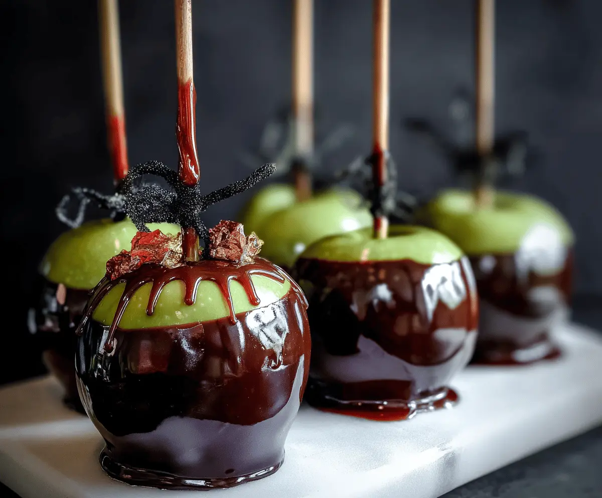 Before the chocolate hardens, sprinkle edible gold leaf flakes or gold sprinkles over the chocolate coating to create the eerie “poisoned” look. This adds a touch of magic to your apples!