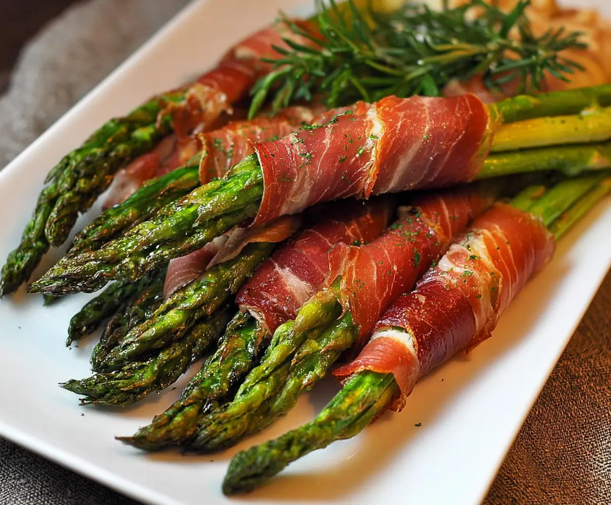Delicious prosciutto-wrapped asparagus spears garnished with herbs.