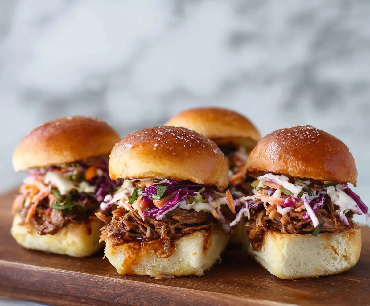 These pulled pork sliders are mini sandwiches that pack big flavor! Tender, slow-cooked pork is slathered in delicious barbecue sauce, all tucked into soft buns.