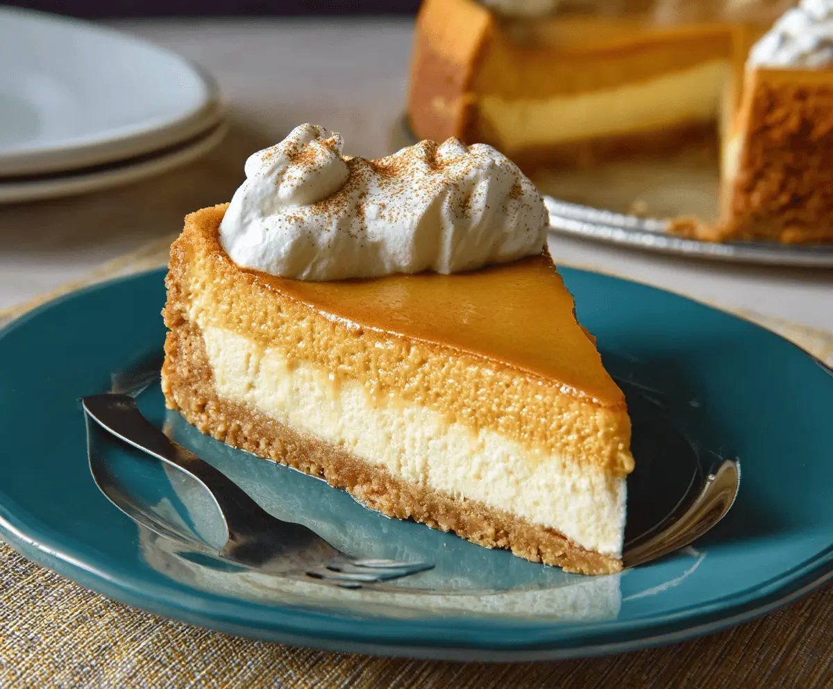 Creamy Pumpkin Pie Cheesecake topped with whipped cream and cinnamon, perfect for fall desserts