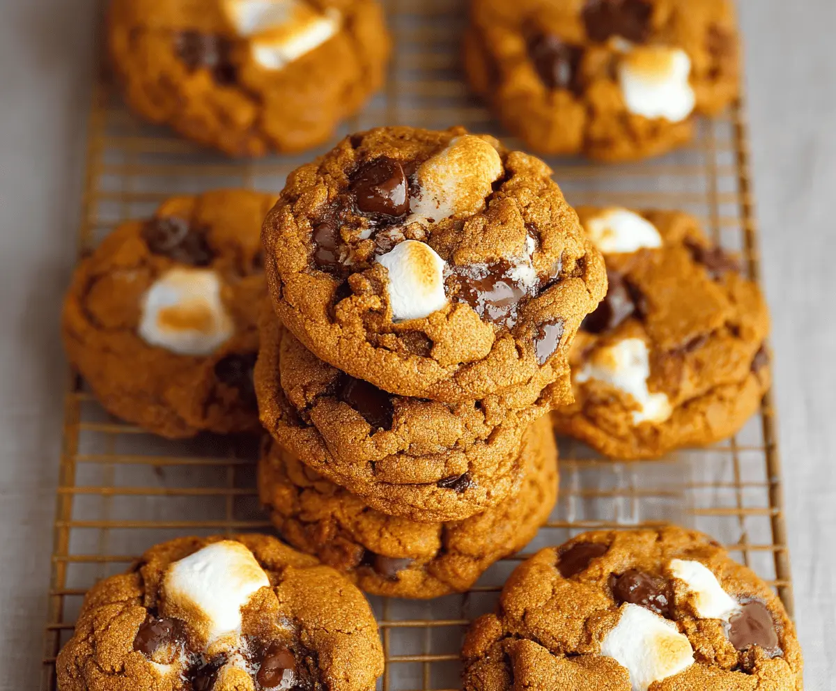 Delicious Pumpkin S'mores Cookies featuring a golden-brown cookie base topped with melted marshmallows and chocolate, perfect for fall treats