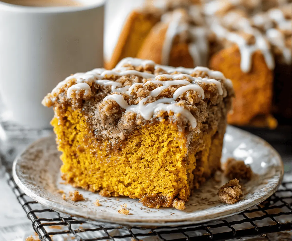 Delicious Pumpkin Streusel Coffee Cake topped with cinnamon streusel and a drizzle of glaze, perfect for fall breakfast or brunch.