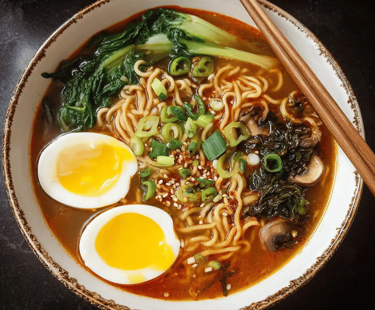 This ramen features a savory miso-soy broth, tender shrimp, nutrient-rich greens, and perfectly soft eggs, making it a comforting and satisfying meal.