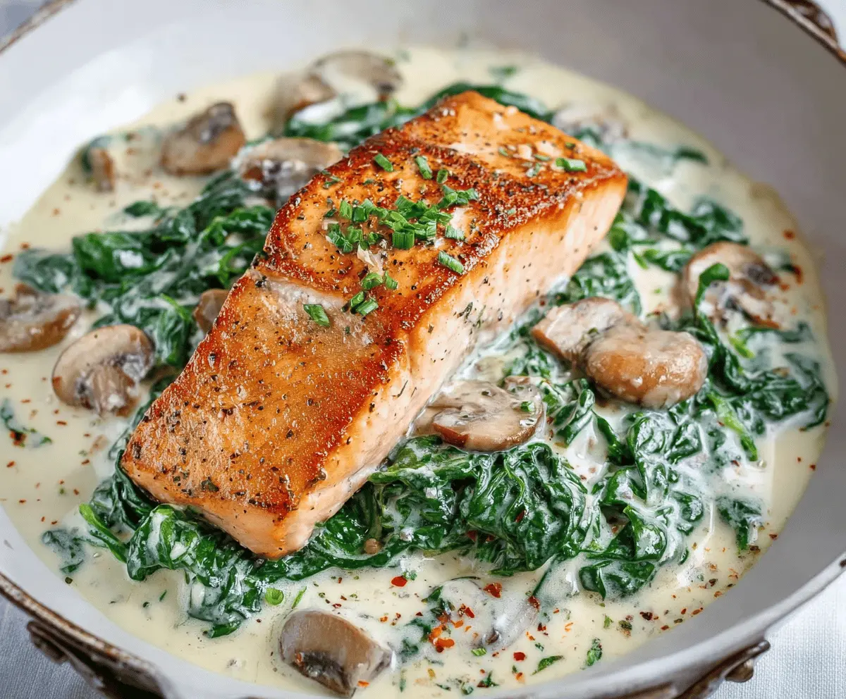 This Salmon Florentine is a treat for your taste buds! It features tender salmon with fresh spinach, all topped with a creamy, garlicky sauce that makes every bite a joy.