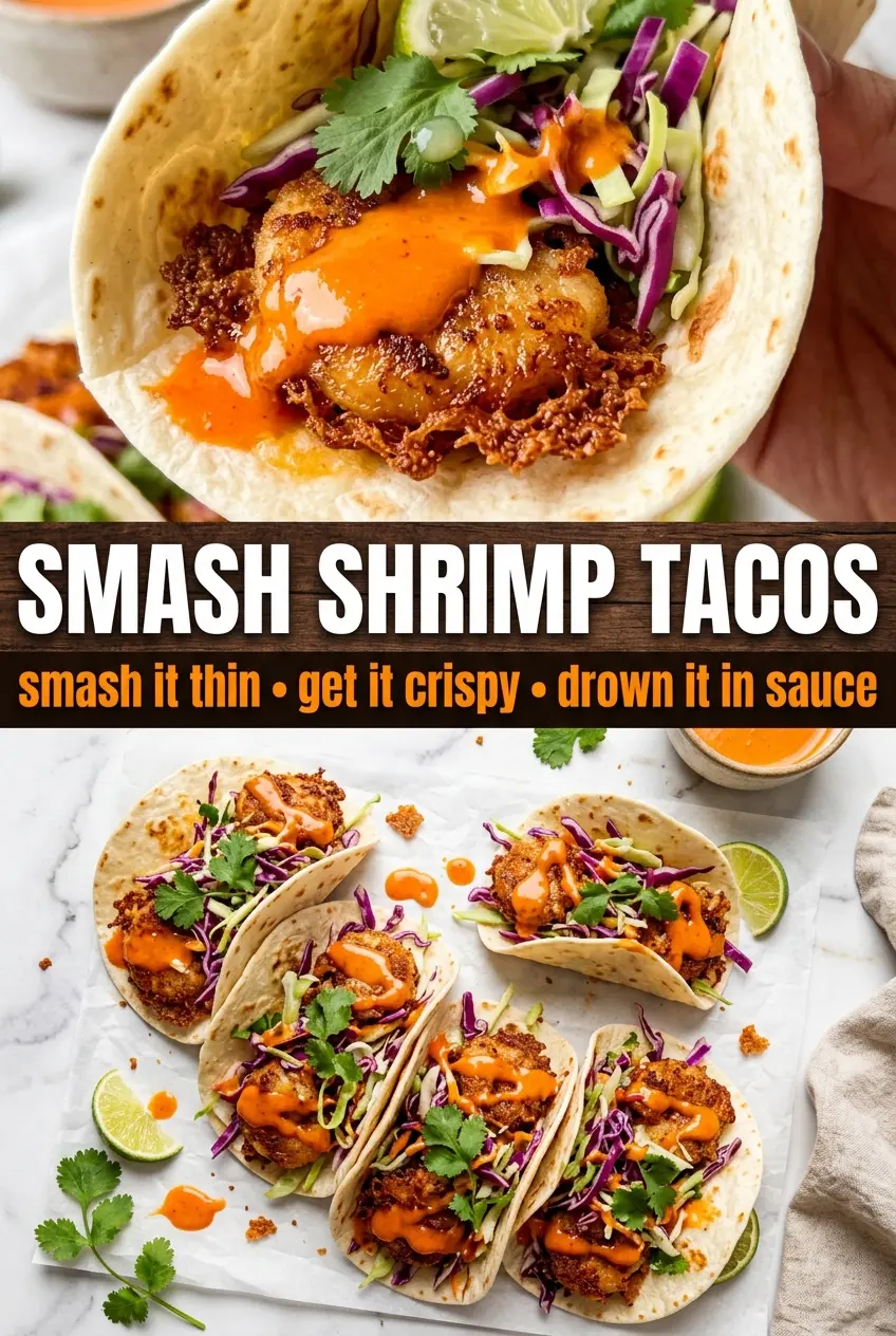 Crispy smash shrimp tacos hit that sweet spot between weeknight fast and diner-plate satisfying. The shrimp patties cook up with browned edges and a tender center, then get tucked into warm tortillas with cool cabbage slaw, avocado, and a squeeze of lime. Every bite has crunch, creaminess, and just enough heat to keep you going back for another taco.