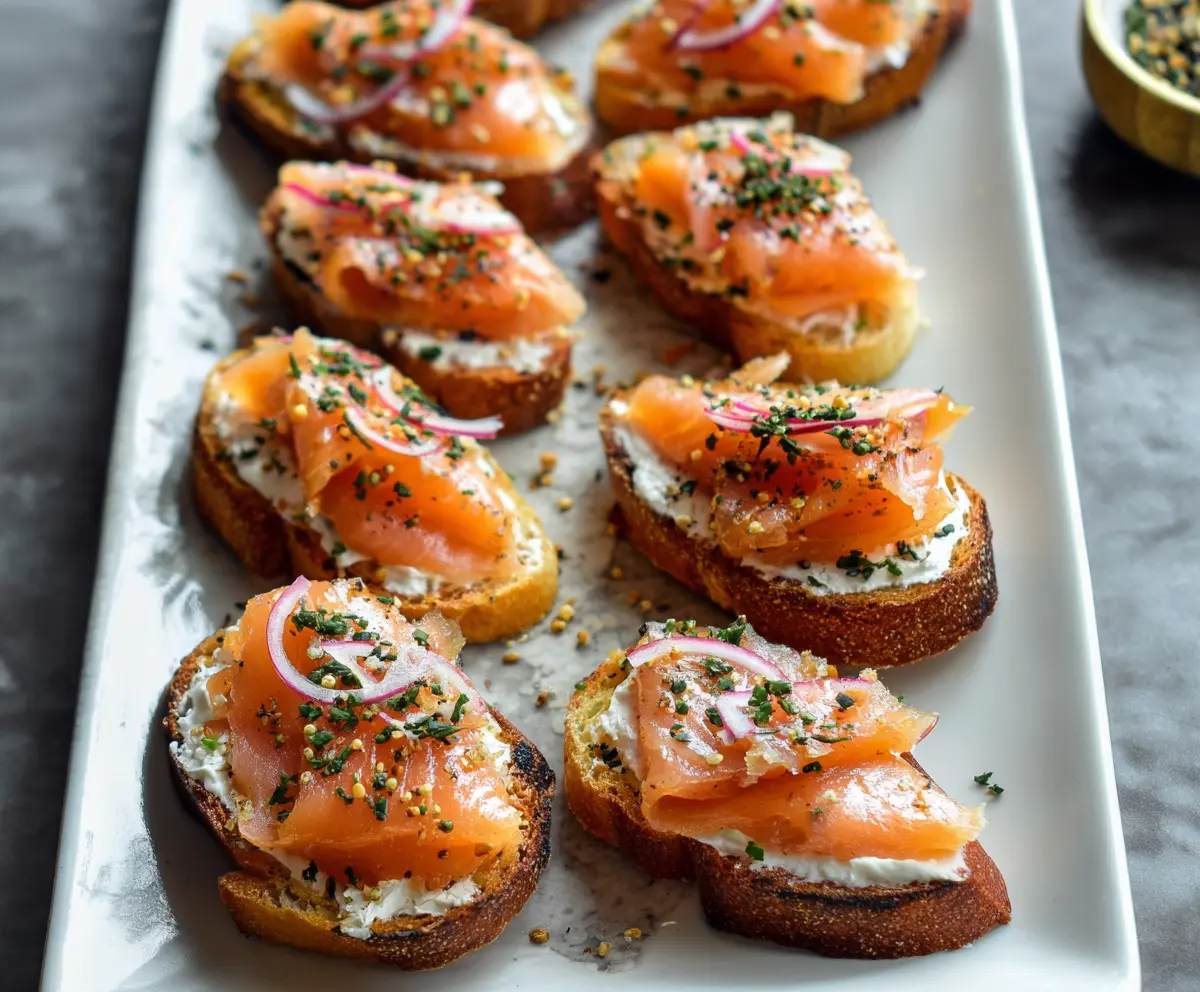 This appetizer is perfect for parties or a light snack, combining crispy toasted bread, creamy cheese, smoky salmon, and fresh herbs for a delightful bite!