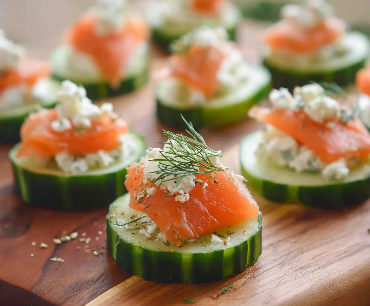 Delicious smoked salmon cucumber bites served on a platter, perfect for appetizers and parties.