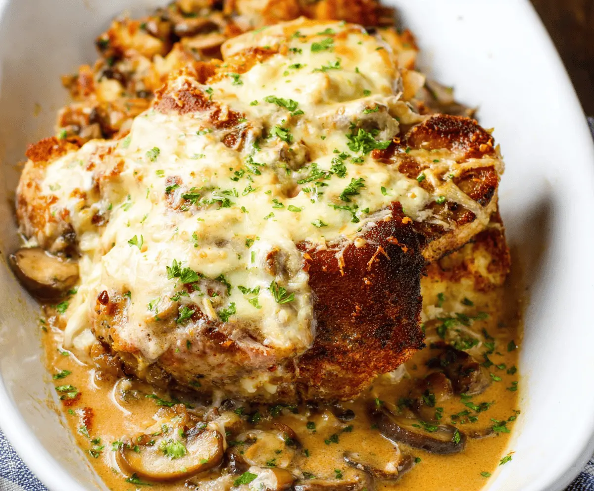 This Smothered Pork Chop Casserole is comfort food at its best! Juicy pork chops sit atop a bed of creamy, cheesy goodness with mushrooms and onions that make every bite special.