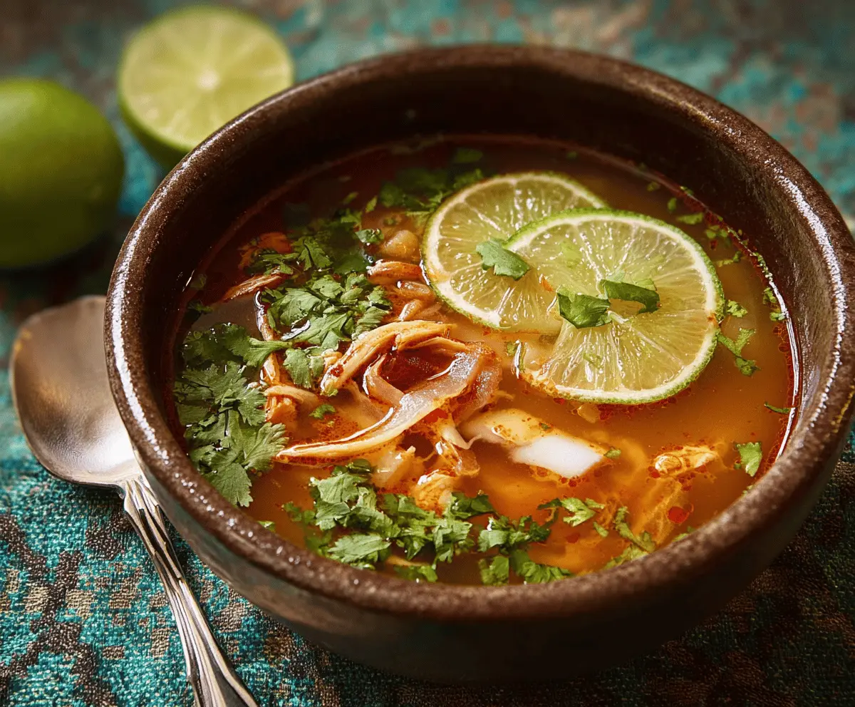 Sopa de Lima is a refreshing Mexican lime soup packed with flavors. It combines chicken, zesty lime juice, and crispy tortilla strips for a hearty treat.